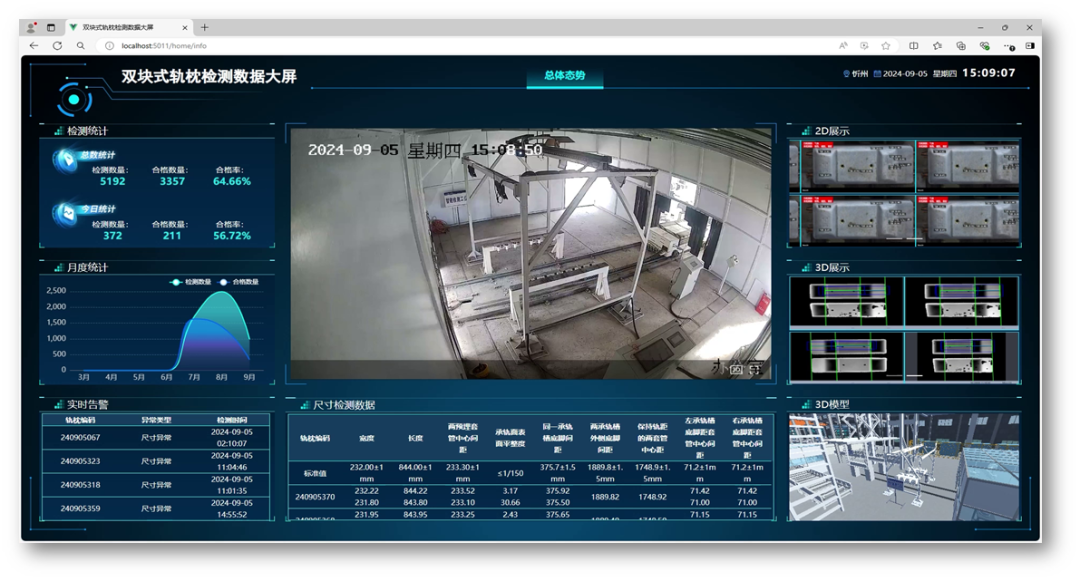 通过使用高精度结构光3D相机、高像素2D工业相机等视觉传感器,系统可以实时采集轨枕表面的图像和数据。智能算法(如机器学习、计算机视觉等)会对这些图像进行分析,以检测轨枕的关键尺寸,以及是否存在裂缝、破损、磨损、偏移等问题。